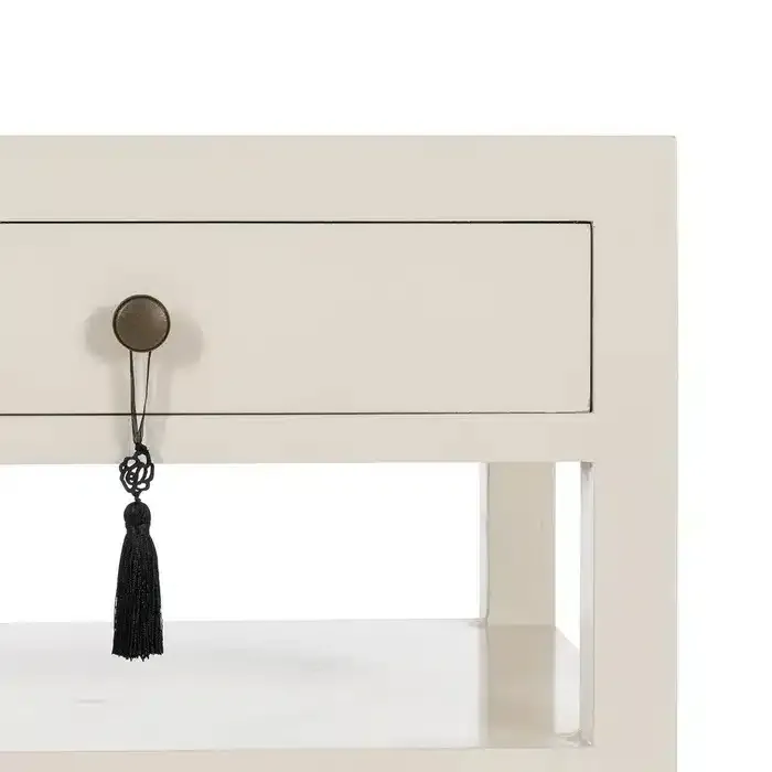 Mesita auxiliar blanca de estilo oriental equipada con dos cajones y un estante. Tiradores en metal dorado.