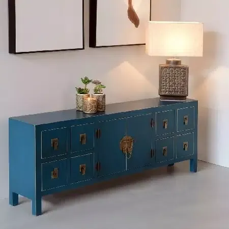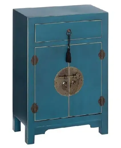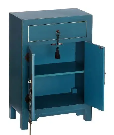 Mueble auxiliar en dm, lacado azul, con 2 puertas y 1 cajón.Interior con 2 baldas.Original cierre estilo oriental en metal dorado envejecido con borla.Disponible en negro,rojo,verde,amarillo y blanco.Entrada almacén junio 2020