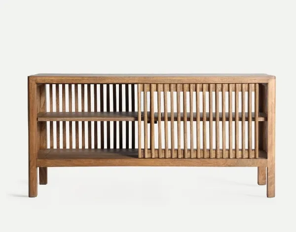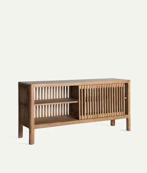 Mueble auxiliar-tv en madera de mango natural con palillería y puerta corredera. Estilo nórdico contemporáneo.