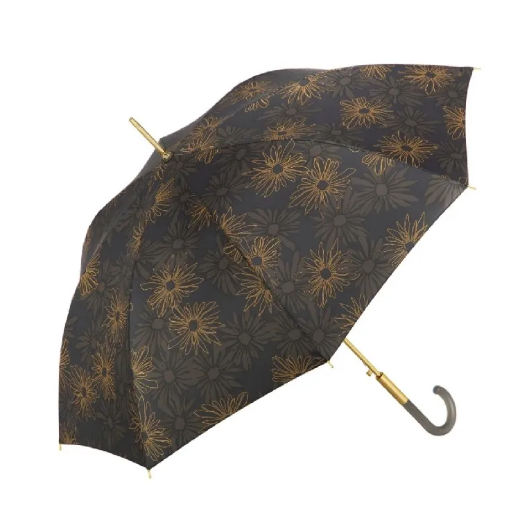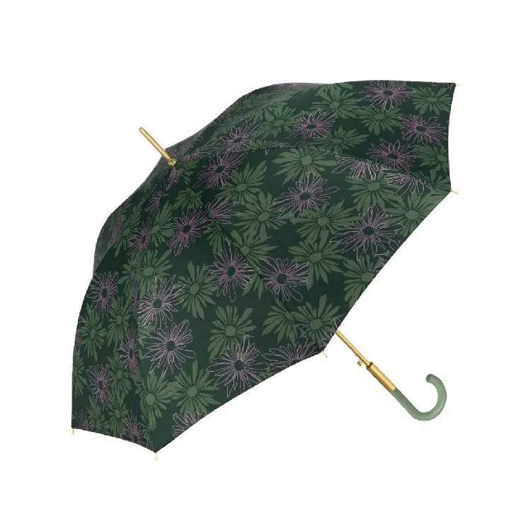 Paraguas largo negro con estampado de flores en tonos verdes. Antiviento. Estilo clásico