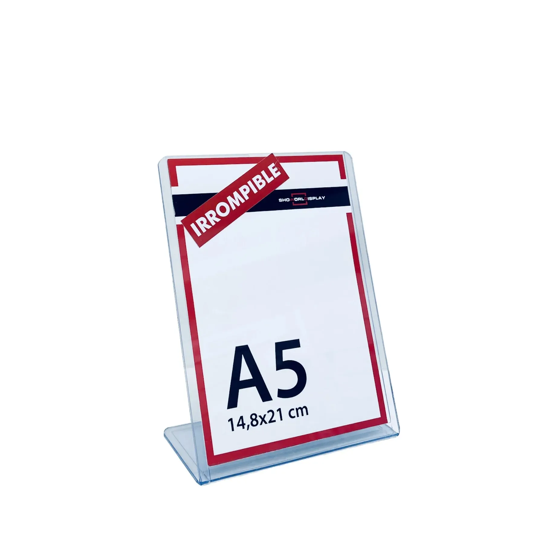 Portacartel PVC vertical con base L. IRROMPIBLE Tamaño A5. Color transparente.
