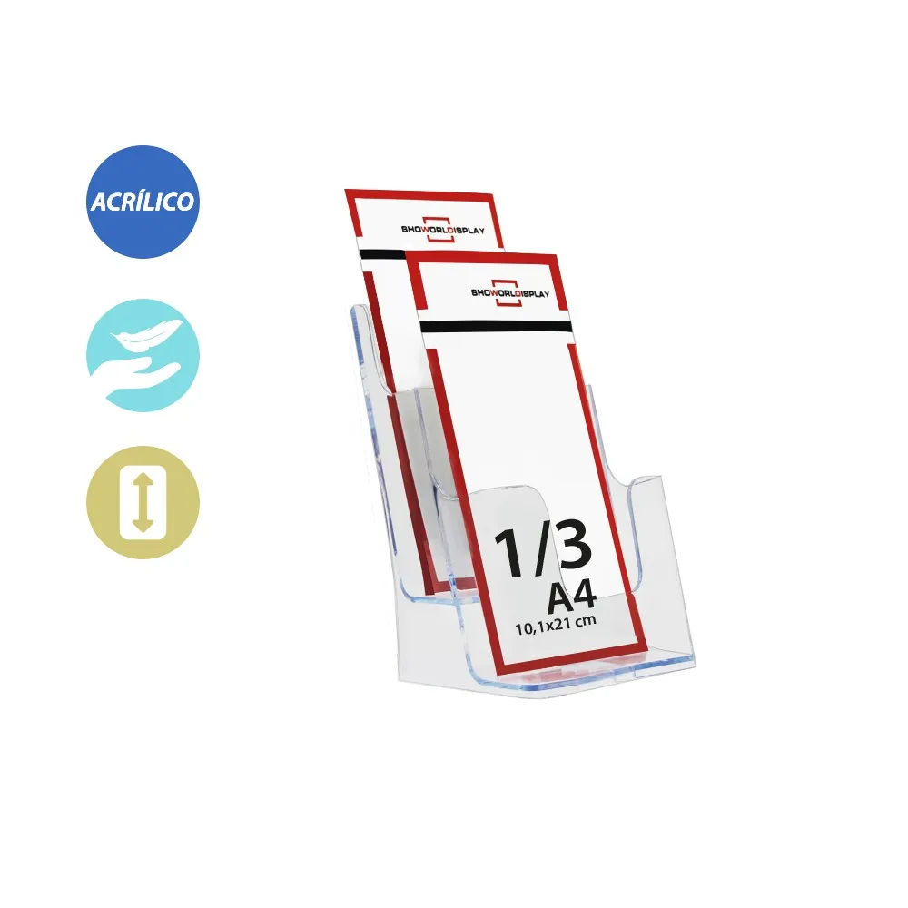 Expositores para folletos en material acrílico transparente tamaño 1/3 A4 de 1 líneas y 2 filas.