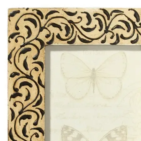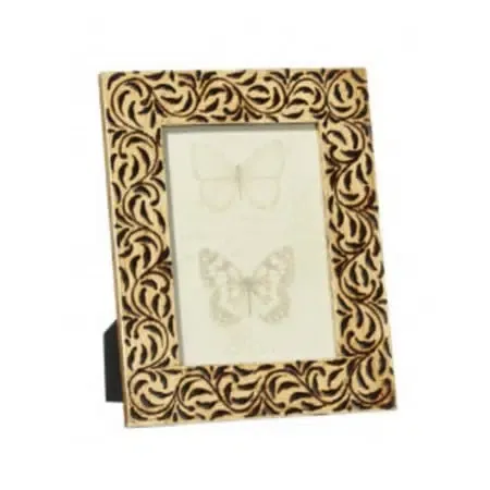 Porafotos en madera crema con grabados vegetales en negro.Posibilidad de posicionamiento en vertical u horizontal.Estilo étnico.Medidas exteriores 19,3×24,3cm.Medidas interiores 13x18cm.Disponibilidad 15x20cm.