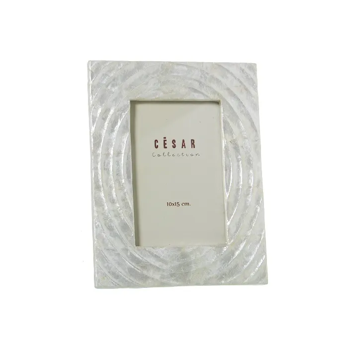 Portafotos en nácar blanco con detalle de ondas grabadas en el marco. Estilo clásico.