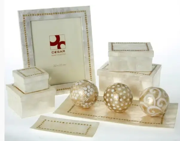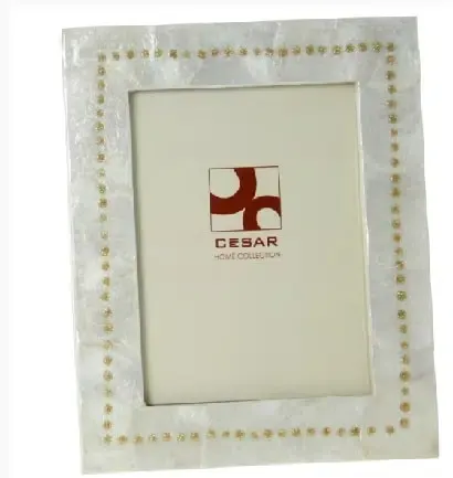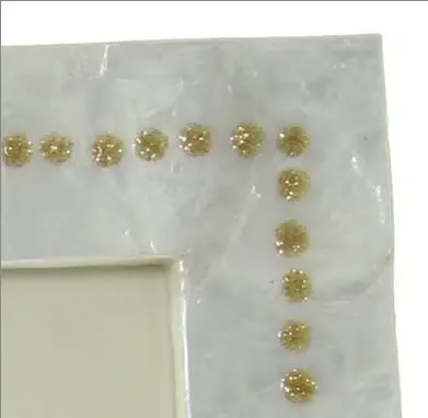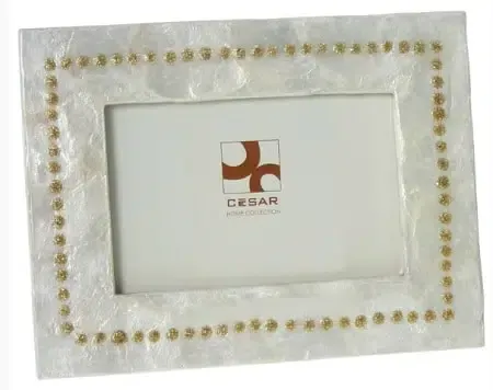 Portafotos en nácar blanco con greca de puntos dorados.Posibilidad de posicionamiento vertical u horizontal.Medida foto 20x25cm. Disponibles otros artículos de la colección.