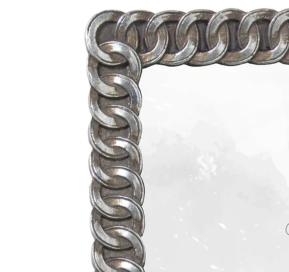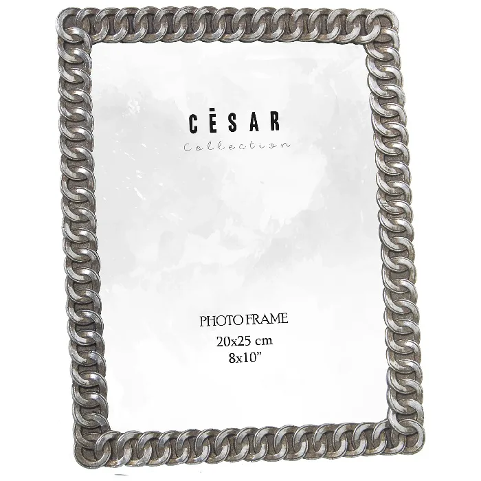 Portafotos en resina con acabado en color plata vieja y marco con relieve en forma de cadenas.