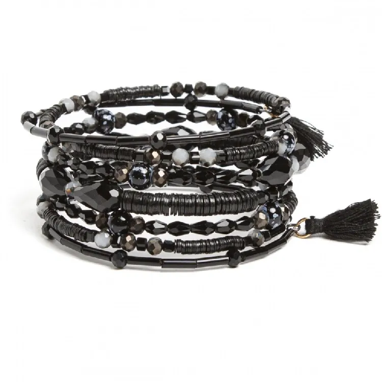 Pulsera tipo coil con cuentas de cristal facetados en negro y xdetalle de borlitas.