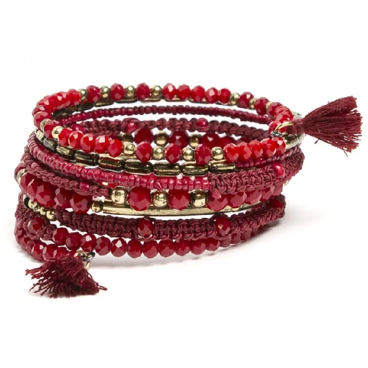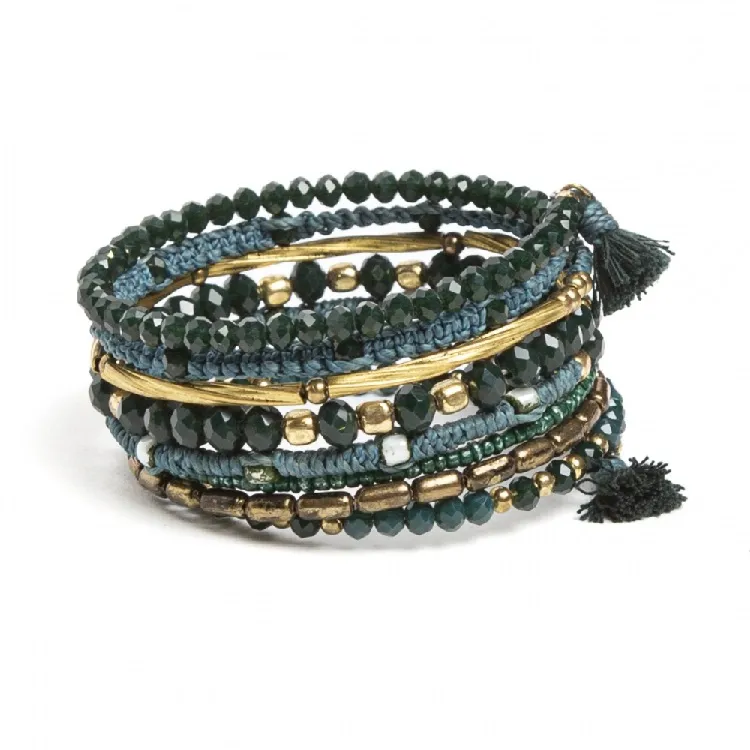 Original pulsera tipo coil ,trenzada en hilo verde y metal dorado con cuentas de cristales facetados y borlitas.