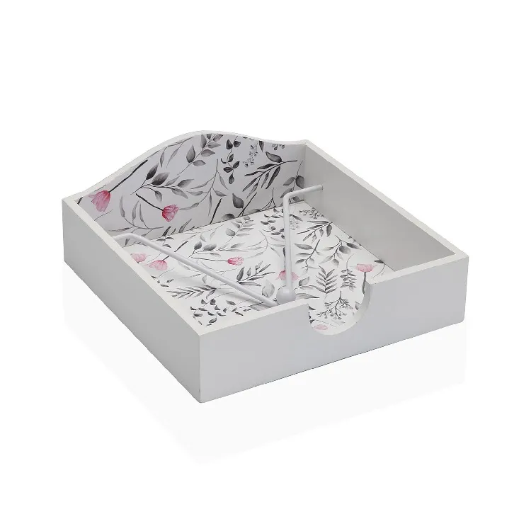 Servilletero en madera blanca con detalles de flores en tonos rosas y grises. Estilo vintage.