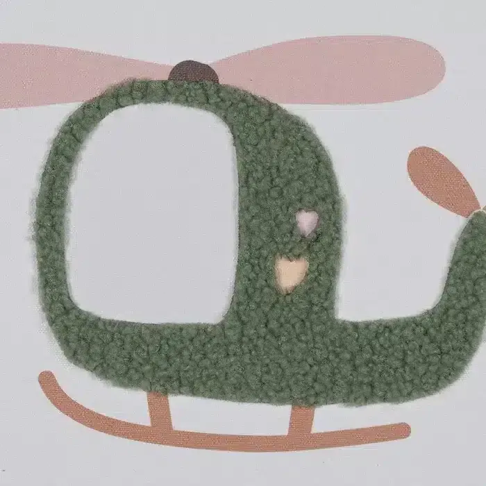 Set de dos cuadros de estilo infantil con dibujo impreso de medios de transportes. Detalles en tejido. Marco en poliestireno blanco.