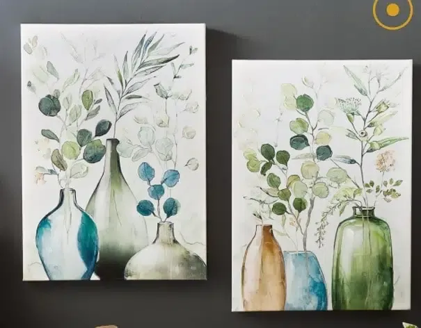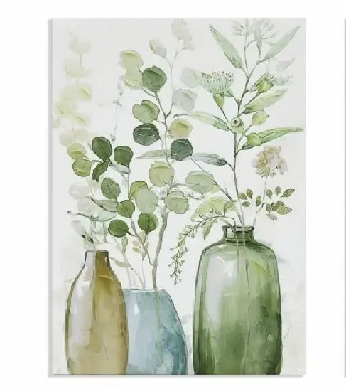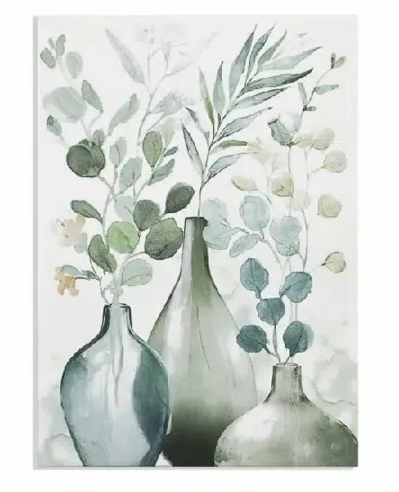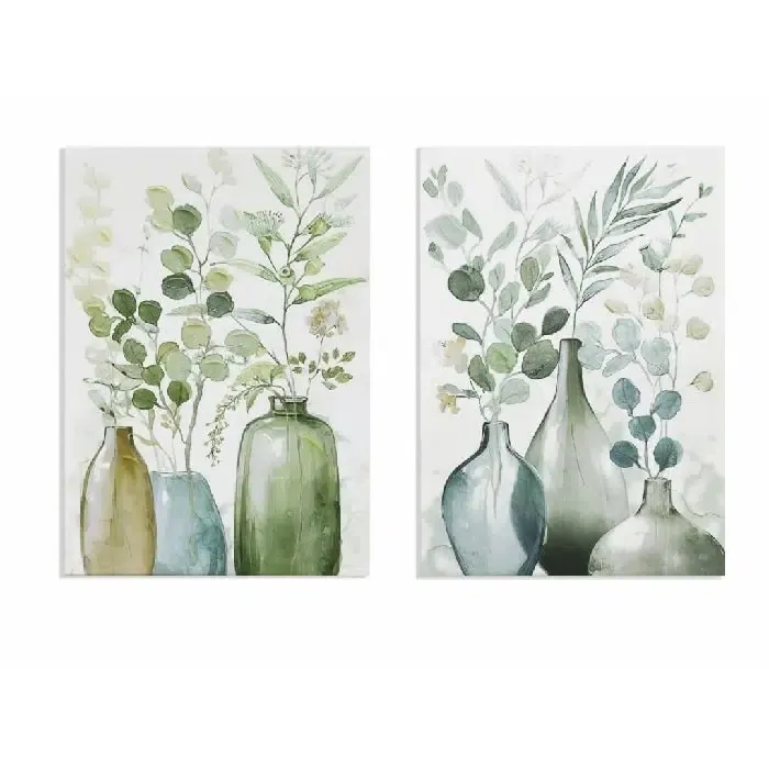 Set de óleos con dibujo de jarrones en colores verdes y azules.Técnica mixta:50&impreso-50%óleo.Bastidor de madera.Estilo clásico.Consultar venta individual.