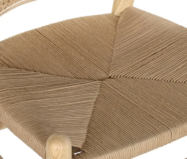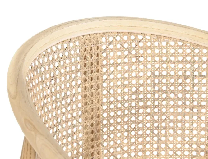 Su estructura de líneas redondeadas está fabricada en madera de olmo natural combinada en el asiento con fibra de ratán trenzado. El respaldo curvo es de rejilla calada natural.
