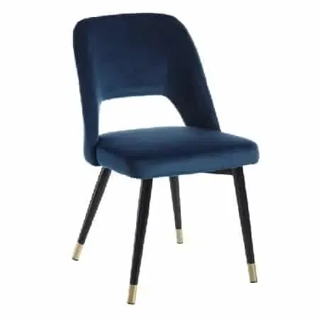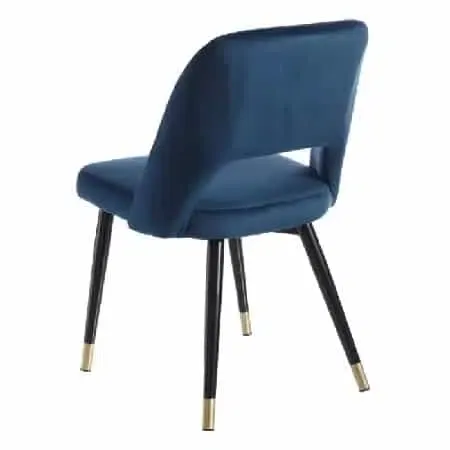 Set de 2 sillas con estructura y patas de hierro acabado en negro.Asiento y respaldo relleno y tapizado en poliéster azul.Medidas 56x49x83 cm.Altura asiento46. Altura de las patas 40cm. Estilo moderno.Entrada en almacén Julio 2020Consultar disponibilidad.