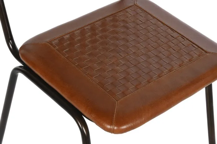 El asiento y el respaldo están acolchados con un confortable relleno de goma espuma y fibra siliconada de gran calidad y tapizados en piel color marrón camel con detalles de cuadritos trenzados.