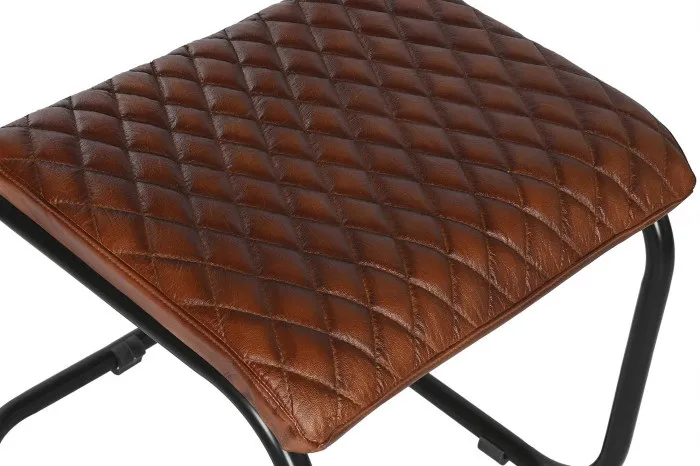 El asiento y el respaldo están acolchados con un confortable relleno de goma espuma y fibra siliconada de gran calidad y tapizados en piel color marrón con rombos pespunteados.