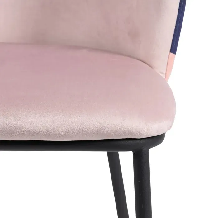 Silla en terciopelo rosa claro combinada en el respaldo con dibujos abstractos multicolor. Patas en hierro negro.