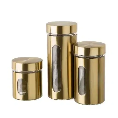Set de 3 botes de cocina en cristal y acero acabado en dorado.MedidasL.8,5dx20.Capacidad:850ml.M:8,5dx15,3cm.Capacidad:650ml.S:8,5x10cm.Capacidad: 350ml.Estilo moderno.No apta `para lavavajillas y microondas.