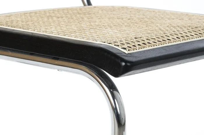 Está fabricada con una estructura de líneas cudradas en metal tubular cromado. Asiento y respaldo en madera de olmo negra combinada con rejilla de ratán natural. Apoyabrazos en madera de olmo negra. Requieren montaje.