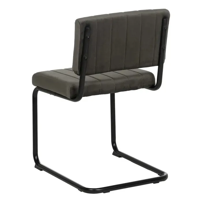 Silla de líneas rectas con asiento y respaldo sobre una estructura de madera contrachapada, dm, acolchada y tapizada en tejido de terciopelo gris oscuro.Patas de metal tubular negro.No requieren montaje.