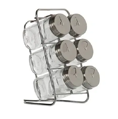 Set dee 6 especieros en cristal con tapa de acero inox.Soporte en metal cromado.Medidas 9.5x14x18cm.Medidas bote 4dx9.5cm.Estilo moderno