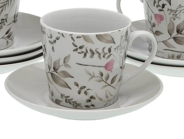 Compuesto por seis tazas y platos, en porcelana blanca con dibujos de flores en tonos rosas y grises.
