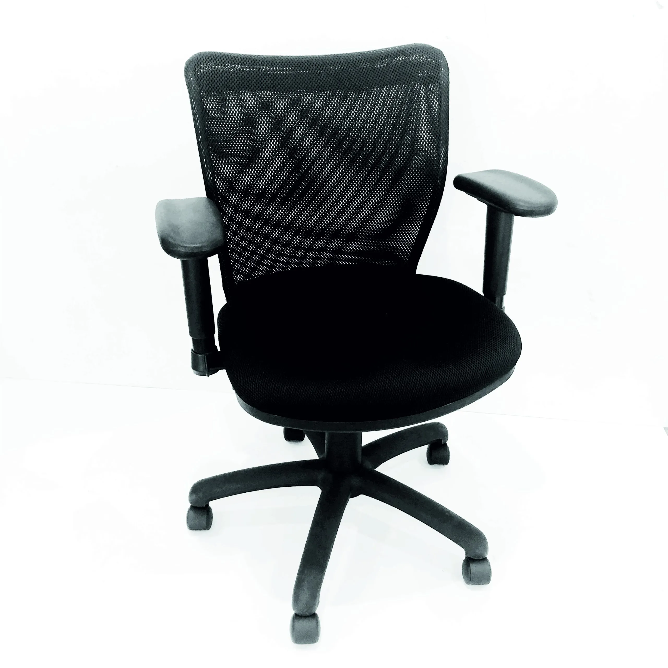 Silla oficina con ruedas y brazos. Respaldo de redecilla. Color negro