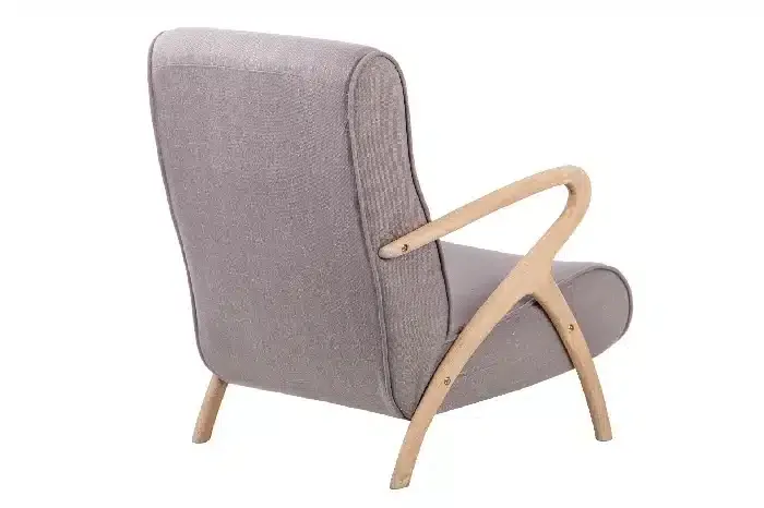 Sillón de estilo nórdico en madera natural. Tapizado en tejido de lino marrón grisáceo.