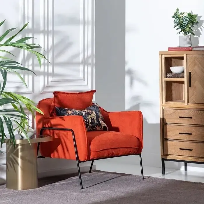 ¿Vas buscando un sillón confortable y a la vez moderno?. Seguro que en la colección Sidney encuentras tu sillón ideal. Realizado con estructura interna en madera de pino y dm,con un suave acolchado y tapizado en poliéster naranja .Su diseño redondeado y envolvente y el cojín posterior te asegurarán horas de relax.Las patas en hierro negro le dan un toque moderno, que te permitirá combinarlo con cualquier estilo: industrial, moderno, nórdico. Perfecto para darle una nota de elegancia al salón, un rincón en el dormitorio o vestidor…Medidas: 77x70xx74cm.Altura asiento: 41cm.Altura respaldo: 40cm.Altura reposabrazos 20cm.Profundidad asiento: 50cm.Altura patas 40cm. Requieren montaje.Relleno esponja.Densidad 28Kg/m3.Consultar disponibilidad.