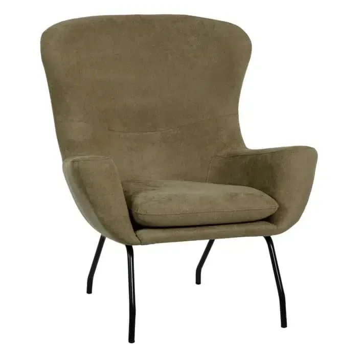 Sillón verde caqui de respaldo alto y estructura envolvente. Tapizado en poliéster.