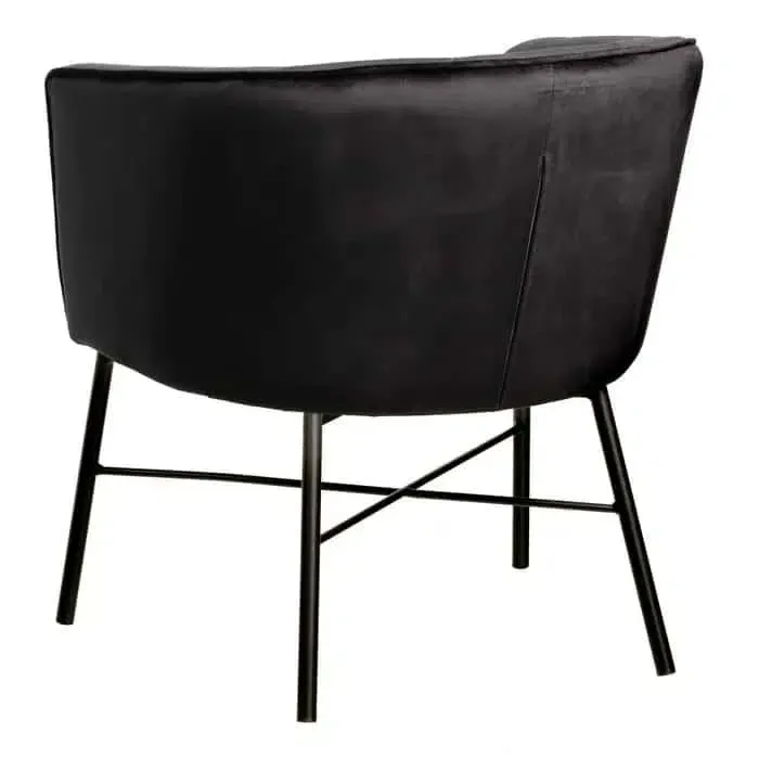 Sillón de estructura redondeada en terciopelo negro y patas en acero negro, de estilo retro.