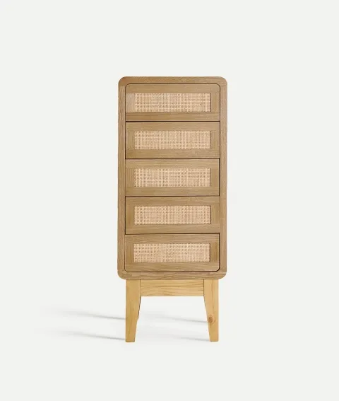 Sinfonier de cinco cajones en madera de abeto combinada con ratán de estilo nórdico.