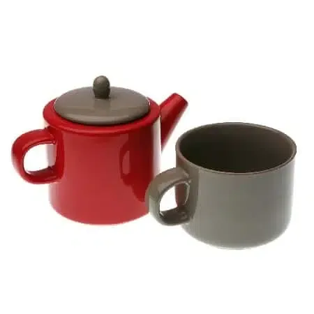 Set de tetera individual y taza en rojo y marrón.Medidas tetera 15x10x11cm.Medida 12x9x7 cm.Estilo moderno.