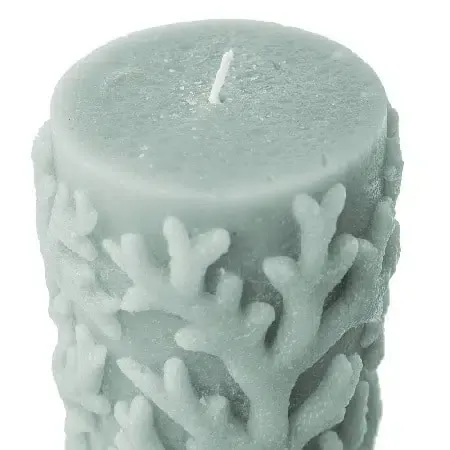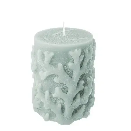 Vela cilíndrica en azul turquesa con labrados marinos.Medidas 8dx10cm. Combustión aproximada 40 horas.Estilo moderno.